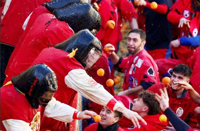 روم : اٹلی میں ’وار آف اورینجز‘ کا فیسٹیول منایا گیا جس میں بڑی تعداد میں لوگوں نے ایک دوسرے پر ’گولہ باری‘ کی۔برطانوی خبر رساں ادارے روئٹرز نے فیسٹیول