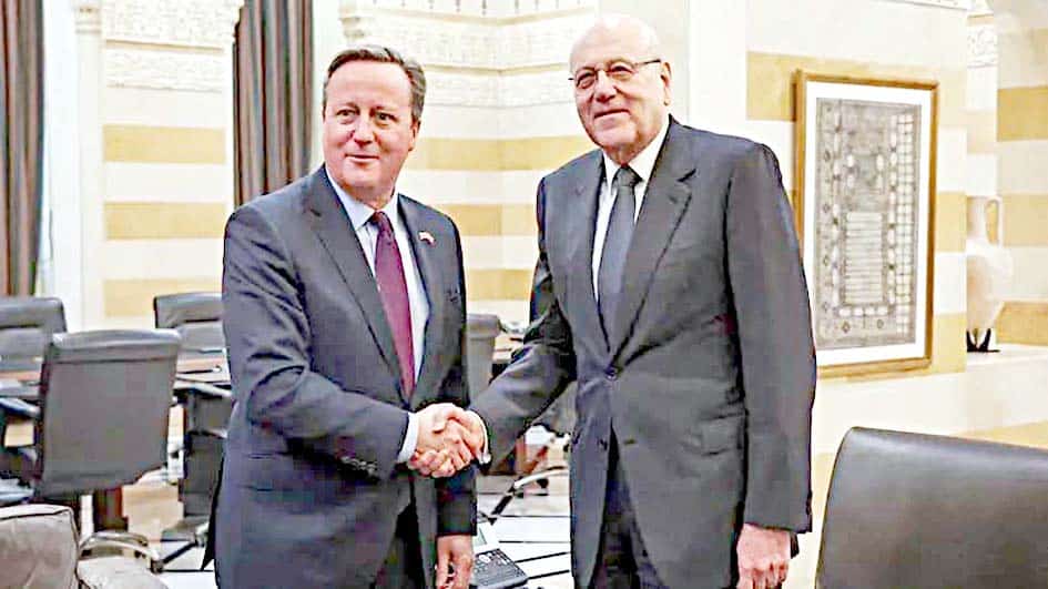 بیروت: برطانوی وزیرِ خارجہ ڈیوڈ کیمرون نے جمعرات کو بیروت میں لبنانی وزیر اعظم نجیب میقاتی کے ساتھ گفتگو میں لبنان اسرائیل سرحد پر امن کی طرف واپسی کی اپیل