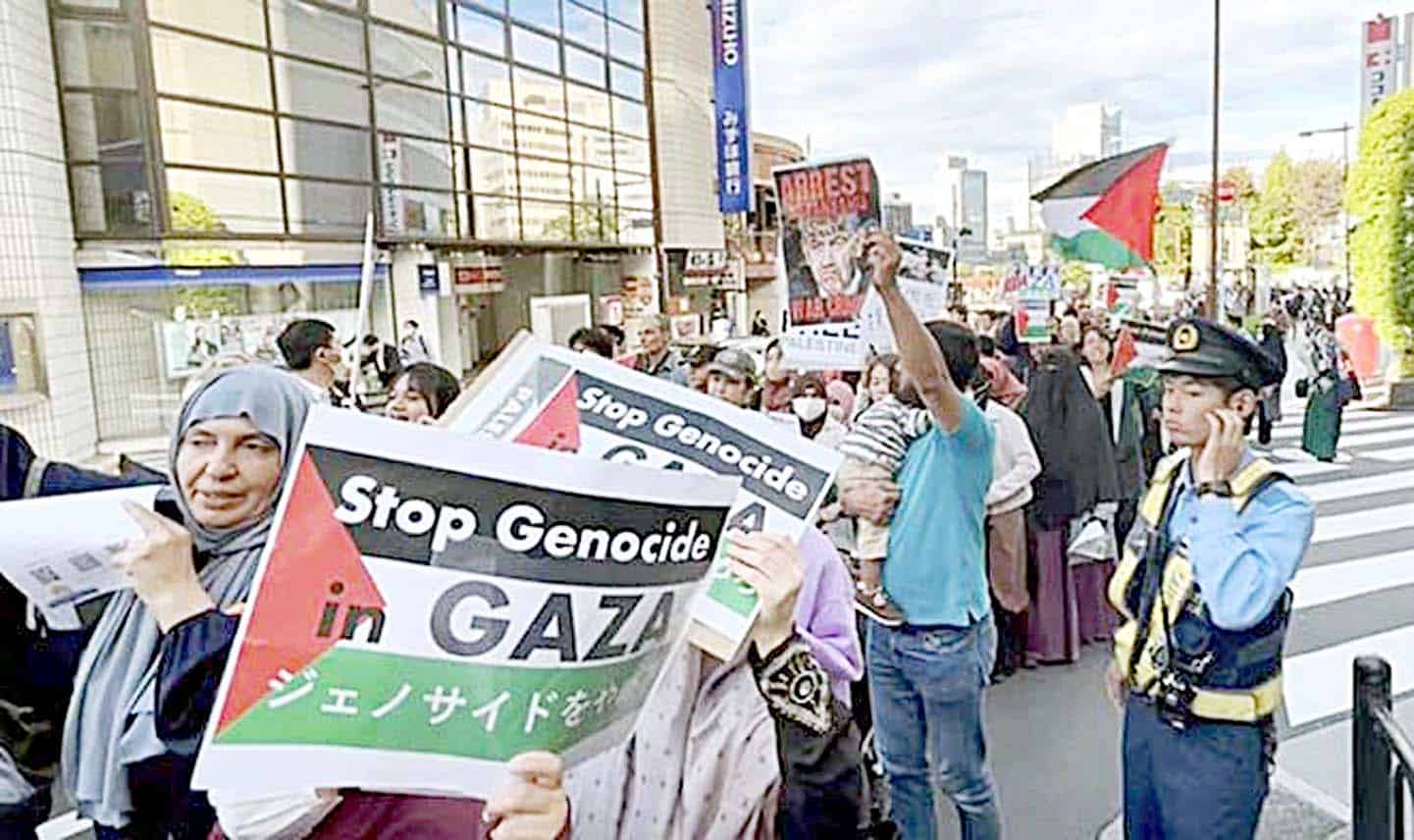 ٹوکیو: جاپان کی مسلم کمیونٹی سے تعلق رکھنے والے تقریباً ایک ہزار مظاہرین نے گذشتہ روز اتوار کو ٹوکیو کے ایچی گائیا ڈسٹرکٹ میں اسرائیلی سفارت خانے کے قریب جمع