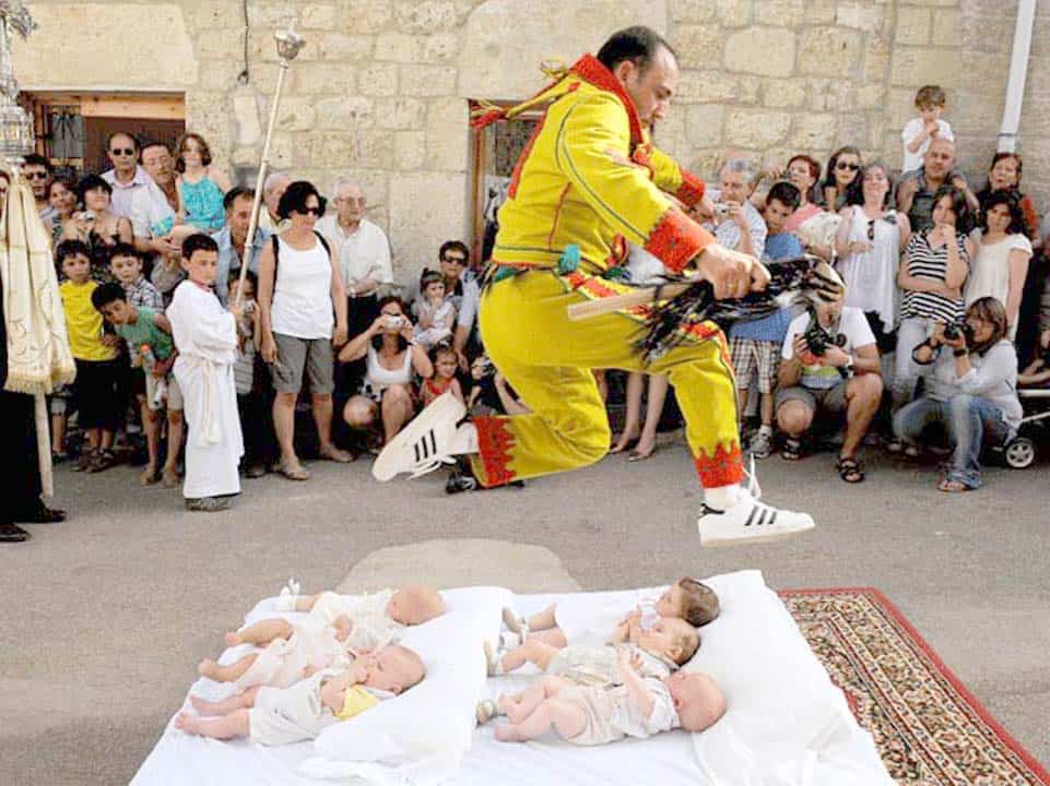 میڈرڈ: اسپین میں ہر سال جون کے دوسرے اور تیسرے ہفتے میں ننھے بچوں کو فرش پر لیٹا دیا جاتا ہے جن کے اوپر سے فرضی شیطان جست لگا کر