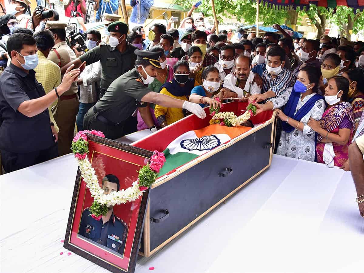 سوریہ پیٹ۔ فوجی جوانوں نے کرنل سنتوش بابو کی نعش کو ترنگا میں لپیٹ کر جمعرات 18جون2020کے روز ان کے آبائی مقام سوریا پیٹ آخری رسومات کی انجام دہی کے لئے لے کر پہنچے۔