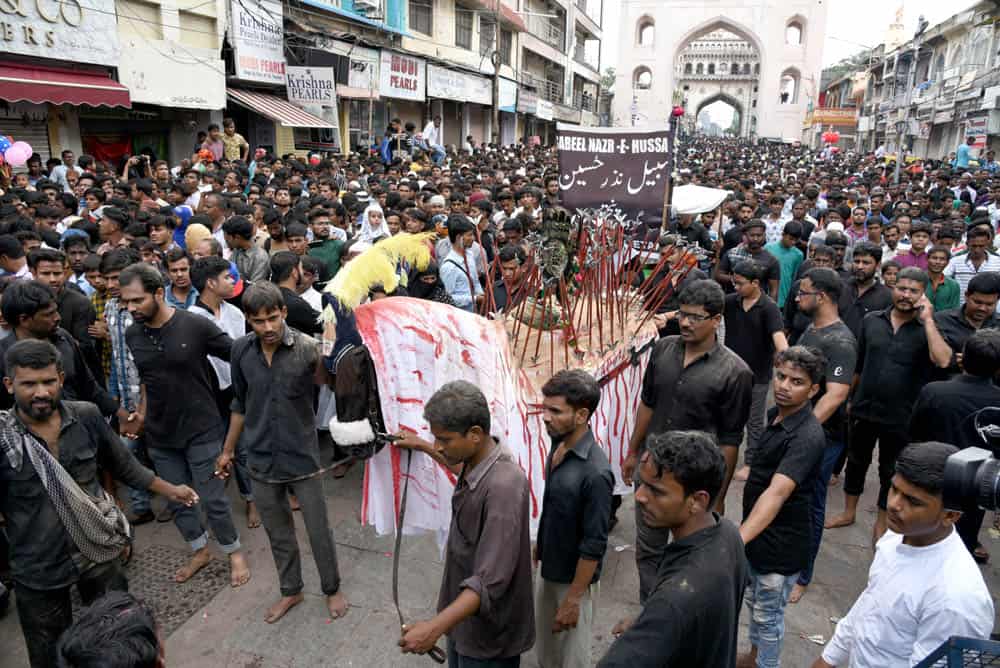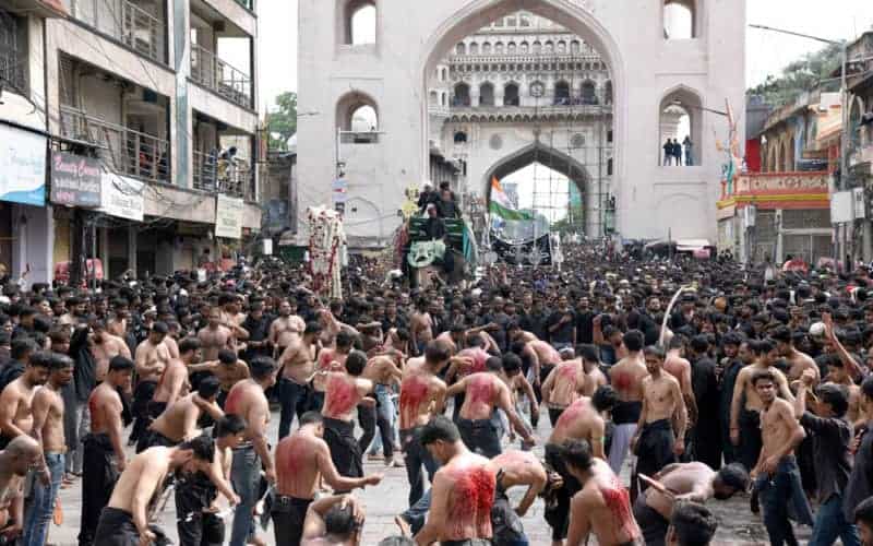حیدرآباد۔قدیم شہر حیدرآباد غم اور ماتم کی ایک فضاء کا ماحول دیکھا گیا کیونکہ منگل کے روز”یوم عاشورہ“ نہایت عقیدت او راحترام کے ساتھ منایاگیا۔شیعہ کمیونٹی کی جانب سے نکالے گئے روایتی اور تاریخی ”بی بی کے عالم“کے دوان لوگ سیاہ لباس زیب تن کئے ماتم کرتے ہوئے دیکھائی دئے۔