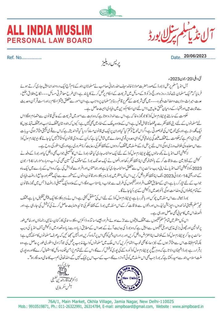 لا کمیشن آف انڈیا نے کچھ سالوں پہلے یونیفارم سول کوڈ کے لئے ایک سوالنامہ جاری کیا تھا، بورڈ نے اس کا تفصیلی جواب بھی داخل کیا اور بورڈ کے وفد نے کمیشن کے چیئرمین سے ملاقات کر کے بالمشافہ بھی اپنا نقطۂ نظر رکھا اور انھوں نے ایک حد تک بورڈ کے موقف کی تحسین بھی کی، اب دوبارہ مؤرخہ: 14؍ جون 2023ء کو لا کمیشن آف انڈیا نے اپنی ویب سائٹ پر اس سے متعلق سوالنامہ جاری کیا ہےاور جماعتوں اور افراد سے خواہش کی ہے کہ وہ اس کے بارے میں ایک ماہ کے اندر یعنی 14؍ جولائی 2023ء تک اپنا نقطۂ نظر داخل کریں، اس پس منظر میں بورڈ ماہر وکلاء اور قانون دانوں کے مشورے سے ایک مختصر اور جامع ڈرافٹ بنیادی جواب کے لئے تیار کر رہا ہے، اسی کے مطابق مختلف افراد اور تنظیموں کی طرف سے جواب دینا مناسب ہوگا، اس کے علاوہ ایک تفصیلی ڈرافٹ (جس میں مجوزہ قانون کے تمام پہلوؤں کی وضاحت ہوگی) کو بعد میں لا کمیشن کے سپرد کیا جائے گا۔