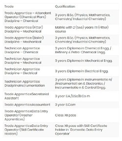 ائی او سی ایل کے ریفائنری‘ گوہاٹی‘ ڈیگبوئی‘ بون گیا گون(تمام تین آسام میں) برانوئی(بہار) وڈوڈرا(گجرات)‘ ہالدیہ (مغربی بنگال)‘ ماتھرا(یوپی) پانی پت(ہریانہ) اور پرادیپ (اڈیشہ) کے درخواستیں مطلوب ہیں۔