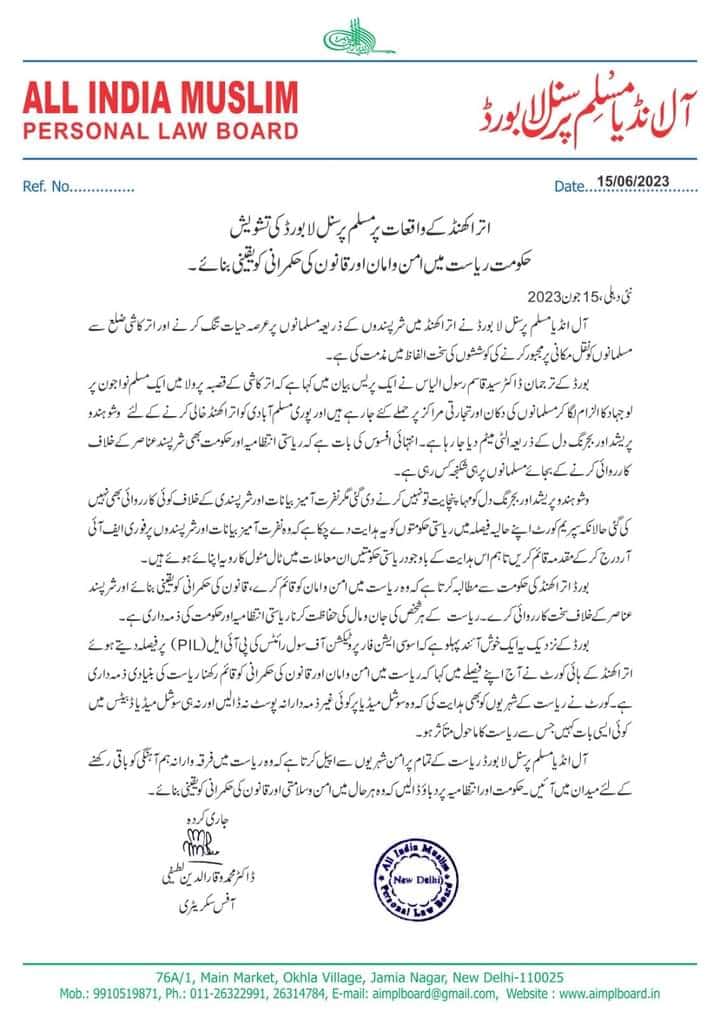 بورڈ اتراکھنڈ کی حکومت سے مطالبہ کر تا ہے کہ وہ ریاست میں امن و امان کو قائم کرے، قانون کی حکمرانی کو یقینی بنائے اور شرپسند عناصر کے خلاف سخت کارروائی کرے۔ ریاست کے ہر شخص کی جان و مال کی حفاظت کر نا ریاستی انتظامیہ اور حکومت کی ذمہ داری ہے۔