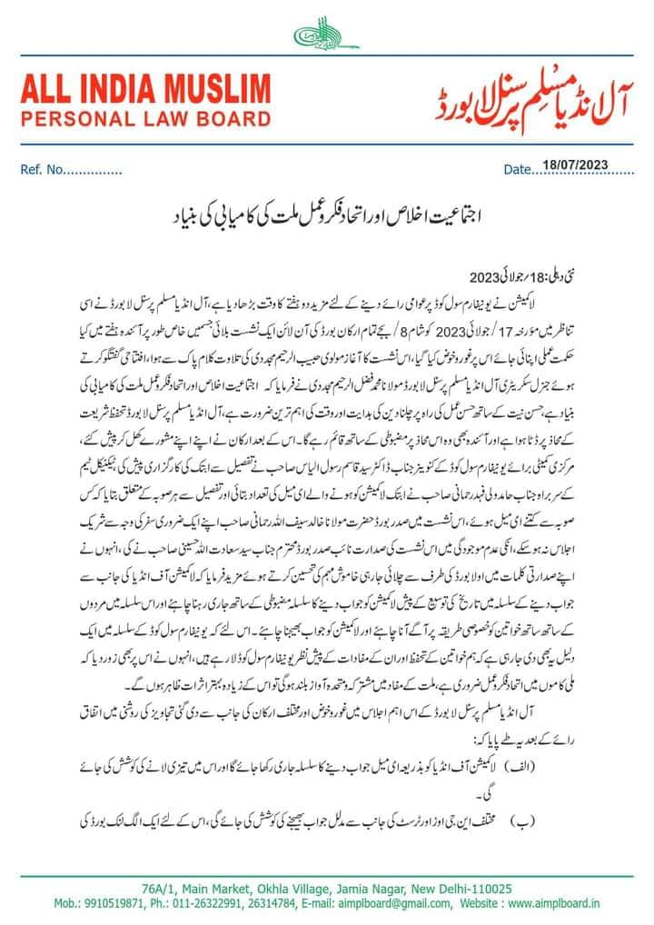 (ہ) آل انڈیا مسلم پرسنل لا بورڈ کی جانب سے لاکمیشن آف انڈیا کو جواب بھیجنے کے سلسلہ میں جو پیش رفت جاری ہے اسے 28؍جولائی تک مسلسل جاری رکھا جائے گا اور مرد حضرات کے علاوہ خواتین کی نشستیں بھی منعقد کی جائیں گی۔