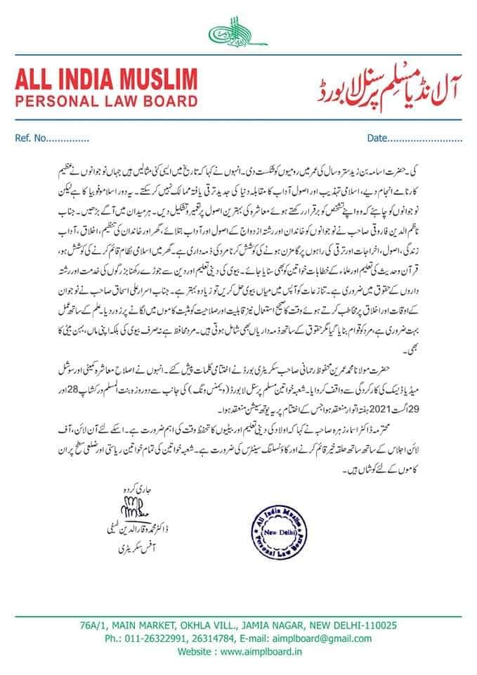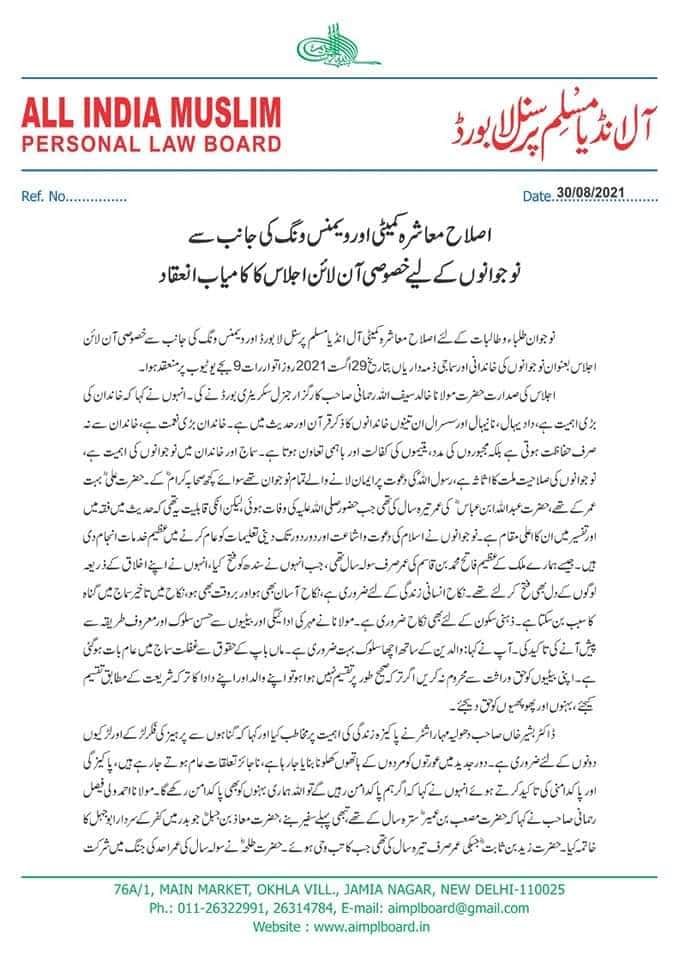 نوجوان طلباء و طالبات کےلئے اصلاح معاشرہ کمیٹی آل انڈیا مسلم پرسنل لا بورڈ اور ویمنس ونگ کی جانب سے خصوصی آن لائن اجلاس بعنوان نوجوانوں کی خاندانی اور سماجی ذمہ داریاں بتاریخ 29 اگست 2021 روز اتوار رات 9 بجے یوٹیوب پر منعقد ہوا۔اجلاس کی صدارت حضرت مولانا خالد سیف اللہ رحمانی صاحب کارگزار جنرل سکریٹری بورڈ نے کی۔ انہوں نے کہا کہ خاندان کی بڑی اہمیت ہے، دادیہال، نانیہال اور سسرال ان تینوں خاندانوں کا ذکر قرآن اور حدیث میں ہے۔ خاندان بڑی نعمت ہے، خاندان سے نہ صرف حفاظت ہوتی ہے بلکہ مجبوروں کی مدد، یتیموں کی کفالت اور باہمی تعاون ہوتا ہے۔ سماج اور خاندان میں نوجوانوں کی اہمیت ہے، نوجوانوں کی صلاحیت ملت کا اثاثہ ہے، رسول اللہ ؐ کی دعوت پر ایمان لانے والے تمام نوجوان تھے سوائےکچھ صحابہ کرامؓ کے۔ حضرت علیؓ بہت عمر کے تھے، حضرت عبداللہ ابن عباسؓ کی عمر تیرہ سال کی تھی جب حضور صلی اللہ علیہ کی وفات ہوئی، لیکن انکی قابلیت یہ تھی کہ حدیث میںفقہ میں اور تفسیر میں ان کا اعلی مقام ہے۔ نوجوانوں نے اسلام کی دعوت و اشاعت اور دور دور تک دینی تعلیمات کو عام کرنے میں عظیم خدمات انجام دی ہیں۔ جیسے ہمارے ملک کے عظیم فاتح محمد بن قاسم کی عمر صرف سولہ سال تھی، جب انہوں نے سندھ کو فتح کیا، انہوں نے اپنے اخلاق کے ذریعہ لوگوں کےدل بھی فتح کرلئے تھے۔ نکاح انسانی زندگی کے لئے ضروری ہے، نکاح آسان بھی ہو اور بروقت بھی ہو، نکاح میں تاخیر سماج میں گناہ کا سبب بن سکتا ہے۔ ذہنی سکون کے لئے بھی نکاح ضروری ہے۔ مولانا نے مہر کی ادائیگی اور بیٹیوں سے حسن سلوک اور معروف طریقہ سے پیش آنے کی تاکید کی۔ آپ نے کہا: والدین کے ساتھ اچھا سلوک بہت ضروری ہے۔ ماں باپ کے حقوق سے غفلت سماج میں عام بات ہوگئی ہے۔ اپنی بیٹیوں کو حق وراثت سے محروم نہ کریں اگر ترکہ صحیح طور پرتقسیم نہیں ہوا ہو تو اپنے والد اور اپنے دادا کا ترکہ شریعت کے مطابق تقسیم کیجئے، بہنوں اور پھوپھیوں کو حق دیجئے۔ڈاکٹر بشیر خاں صاحب دھولیہ مہاراشٹر نے پاکیزہ زندگی کی اہمیت پر مخاطب کیا اور کہا کہ گناہوں سے پرہیز کی فکر لڑکے اور لڑکیوں دونوں کےلئے ضروری ہے۔ دور جدید میں عورتوں کو مردوں کے ہاتھوں کھلونا بنایا جارہا ہے، ناجائز تعلقات عام ہوتے جارہے ہیں، پاکیزگی اور پاکدامنی کی تاکید کرتے ہوئے انہوں نے کہا کہ اگر ہم پاکدامن رہیں گے تو اللہ ہماری بہنوں کو بھی پاکدامن رکھے گا۔ مولانا احمد ولی فیصل رحمانی صاحب نے کہا کہ حضرت مصعب بن عمیرؓ سترہ سال کے تھے، تبھی پہلے سفیر بنے، حضرت معاذبن جبلؓجو بدر میں کفر کے سردار ابوجہل کا خاتمہ کیا۔ حضرت زیدبن ثابتؓ جبکی عمر صرف تیرہ سال کی تھی جب کاتب وحی ہوئے۔ حضرت طلحہؓ نے سولہ سال کی عمر احد کی جنگ میں شرکت کی۔ حضرت اسامہ بن زید سترہ سال کی عمر میں رومیوںکو شکست دی۔ انہوں نے کہا کہ تاریخ میں ایسی کئی مثالیں ہیں جہاں نوجوانوں نے عظیم کارنامے انجام دیے، اسلامی تہذیب اور اصول آداب کا مقابلہ دنیا کی جدید ترقی یافتہ ممالک نہیں کرسکتے۔ یہ دور اسلاموفوبیا کا ہے لیکن نوجوانوںکو چاہئے کہ وہ اپنے تشخص کو برقرار رکھتے ہوئے معاشرہ کی بہترین اصول پر تعمیر و تشکیل دیں۔ ہر میدان میں آگے بڑھیں۔ جناب ناظم الدین فاروقی صاحب نے نوجوانوں کو خاندان اور رشتہ ازدواج کے اصول اور آداب بتلائے، گھر اور خاندان کی تنظیم، اخلاق ، آداب زندگی، اصول، اخراجات اور ترقی کی راہوں پر گامزن ہونے کی کوشش کرنا مرد کی ذمہ داری ہے۔ گھر میں اسلامی نظام قائم کرنے کی کوشش ہو، قرآن و حدیث کی تعلیم اور علماء کے خطابات خواتین کو بھی سنایا جائے۔ بیوی کی دینی تعلیم اور دین سے جوڑے رکھنا بزرگوں کی خدمت اور رشتہ داروں کے حقوق میں ضروری ہے۔ تنازعات کو آپس میں میاں بیوی حل کریں تو زیادہ بہتر ہے۔ جناب اسرار علی اسحاق صاحب نے نوجوان کے اوقات اور اخلاق پر مخاطب کرتے ہوئے وقت کا صحیح استعمال نیز قابلیت اور صلاحیت کو مثبت کاموں میں لگانے پر زور دیا۔ علم کے ساتھ عمل بہت ضروری ہے، مرد کو قوام بنایا گی