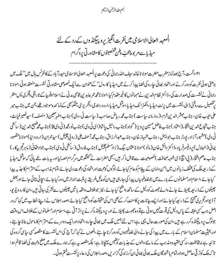 ۲۱؍ اگست ، آج بعد نماز مغرب حضرت مولانا خالد سیف اللہ رحمانی کی دعوت پر المعہد العالی الاسلامی حیدرآباد کے کانفرنس ہال میں “ملک میں بڑھتی ہوئی نفرت کو دور کرنے اور اتحاد بھائی چار ہ کی فضا پیدا کرنے میں میڈیا کا رول” کے عنوان سے ایک خصوصی مشاورتی نشست منعقد ہوئی، مولانا رحمانی نے نشست کی صدارت کی ، ڈاکٹر نظام الدین نے مہمانوں کا خیر مقدم کیا، مولانا محمد عمر عابدین قاسمی مدنی نے اسلاموفوبیا کے تاریخی وفکری پس منظر پر تفصیل سے روشنی ڈالی، نشست میں پرنٹ میڈیا ، الکٹرانک میڈیا، سوشل میڈیا ، اردو، ہندی، انگریزی، تلگو سبھی کے نمائندہ موجود تھے، جن میں جناب میر علی ایوب خان، جناب مبشر الدین خرم،(روزمانہ سیاست) جناب محمد ریاض صاحب (سیاست ٹی، وی) جناب اطہر معین( منصف) سید نصیر غیاث، جناب شجاع الدین افتخار (اعتماد) جناب فاضل حسین پرویز (گواہ) جناب راحیل پاشا (ای ٹی وی) جناب نور محمد (ٹی وی 9)جناب محمد فصیح الدین (ساکشی ٹی وی) مشہور آزاد رپورٹر جناب ابو ایمل، جناب شہباز خان، جناب عبدالرزاق، جناب محمد آصف علی (روبی چینل) سید عمران (اردو دنیا)مولانا مقصود یمانی (الہلال) پروفیسر فریاد ، ڈاکٹر دانش خان (مانو) مولانا عثمان بیگ (زاد مسلم چینل) جناب فاروق (ساکشی ٹی وی) جناب جواد حقانی (ماہر تجزیہ کار) جناب عاصم افتخار (پی ایچ ڈی شعبہ صحافت)خصوصیت سے قابل ذکر ہیں، سبھی حضرات نے گفتگو میں سر گرام حصہ لیا اور یہ بات طے پائی کہ سوشل میڈیا کے ذریعہ ملک کی مختلف زبانوں میں امن وامان کے پیغام کو عام کیا جائے، لوگوں کو محبت اور اتحاد کی دعوت دی جائے، تمام مذاہب کے احترام کا جذبہ پیدا کیا جائے، اسلام اور مسلمانوں کے بارے میں جو غلط فہمیاں پیدا کی جارہی ہیں ان کو مدلل طریقہ پر مثبت انداز میں دور کیا جائے، سچائی بتائی جائے اور بعض چینلوں کے ذریعہ پھیلائے جانے والے جھوٹ کو دلیل کے ساتھ واضح کیا جائے، نیز جو خلاف واقعہ باتیں چینلوں سے نشر کی جاتی ہیں، ان کا رد ویڈیو، آٖڈیو اور تحریری میسیج کے ذریعہ کیا جائے اور ایسے بیانات پر کامنٹ کر کے بھی اس کی حقیقت کو واضح کیا جائے، صدر اجلاس نے اپنے خطاب میں کہا کہ در اصل جب کسی طبقہ کے پاس دلیل کی قوت نہیں ہوتی ہے تو وہ جھوٹ پھیلانے اور پروپیگنڈہ کرنے پر اتر آتی ہے، اسلام اور مسلمانوں کے خلاف اس وقت جو لوگ پروپیگنڈہ کر رہے ہیں، ان کی صورت حال یہی ہے؛ اس لئے ہمیں ملک میں بھائی چارہ ، اتحاد اور ایک دوسرے کے احترام کا ماحول بنانا چاہئے، اور بحیثیت مسلمان اسلام کے بارے میں پیدا کی جانے والی غلط فہمیوں کو دور کرنا چاہئے، انھوں نے کہا کہ آج کی اس نشست کا مقصد کسی سیاسی گروہ کی تائید ہے نہ مخالفت، نہ کسی عقیدہ ومذہب کے ماننے والوں کے جذبات کو ٹھیس پہنچانا ہے؛ بلکہ مقصد یہ ہے کہ ہمارے ملک میں صلح ومحبت کی فضا قائم ہو؛ تاکہ ملک کو ترقی حاصل ہو اور تمام باشندگان ملک بھائی بھائی بن کر زندگی گزاریں، صدر اجلاس کی دعاء پر نشست ختم ہوئی۔