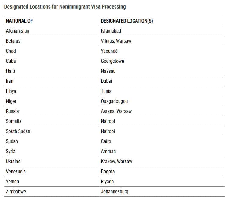 ان ممالک کے شہریوں کو جہاں امریکہ معمول کے مطابق ویزا آپریشن نہیں کر رہا ہے، کو کسی نامزد سفارت خانے یا قونصل خانے میں درخواست دینی چاہیے، الا یہ کہ وہ کہیں اور مقیم ہوں۔