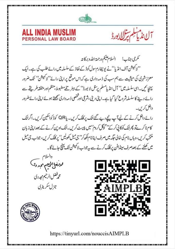 آپ سب کے علم میں ہےکہ ہمارے ملک میں یکساں سول کوڈ کو نافذ کرنے کی فضاء ہموار کی جارہی ہے اور الگ الگ مذاہب اور تہذیبوں کے اس ملک کو کامن سول کوڈ کے ذریعے مذہبی اور تہذیبی آزادی پر یلغار ہورہی ہے، اسی سلسلے میں لاء کمیشن آف انڈیا نے ملک کے شہریوں سے یکساں سول کوڈ کے بارے میں رائے مانگی ہے، ہمیں اس سلسلے میں بڑے پیمانے پر جواب دینا چاہیے اور یکساں سول کوڈ کی مخالفت کرنی چاہیے۔ اسی سلسلے میں یہ لنک آپکو بھیجی جارہی ہے جسکے استعمال کا طریقہ یہ ہے نیچےدی گئی لنک پر کلک کریں اور جی میل کھولنے پر جوابی مواد آپ کے سامنے آجائے گا آپ وہاں نام کے خانہ میں اپنا نام لکھیں اور سینڈ کےبٹن پر کلک کردیں لاء کمیشن کو آپ کا جواب پہنچ جائے گا۔
