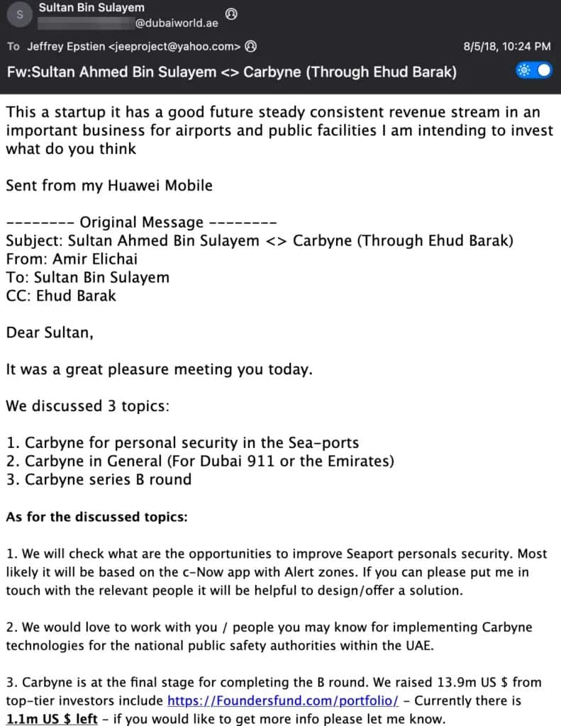 دونوں ممالک کے تعلقات ترقی کی منازل طے کرتے رہے، اور 5 اگست 2018 کو سلیم نے ایپسٹین کو ای میل کیا، کاربائن میں دلچسپی ظاہر کرتے ہوئے، ایک اسرائیلی سائبرسیکیوریٹی فرم جسے ایپسٹین نے مالی اعانت فراہم کی اور باراک کی سربراہی میں، جس نے ایمرجنسی ڈسپیچرز اور سیکیورٹی ایجنسیوں کو درست مقام کے ڈیٹا اور موبائل فون سے لائیو آڈیو اور ویڈیو فیڈز تک رسائی حاصل کرنے کے قابل بنایا۔