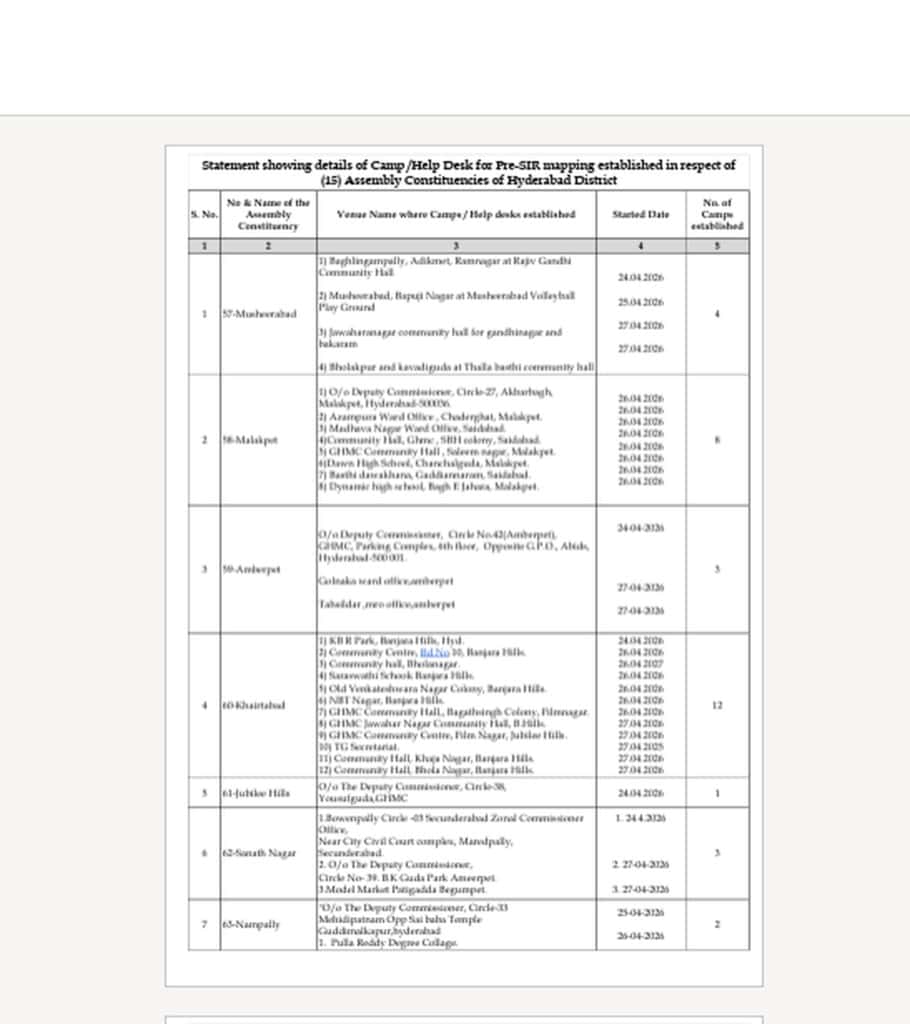 دریں اثنا، حیدرآباد کے ڈسٹرکٹ الیکشن آفیسر (ڈی ای او) آر وی کرنان نے انتخابی فہرستوں کے آئندہ ایس آئی آر کی تیاریوں کے حصے کے طور پر عہدیداروں کو روزانہ میپنگ کے اہداف تفویض کیے ہیں۔