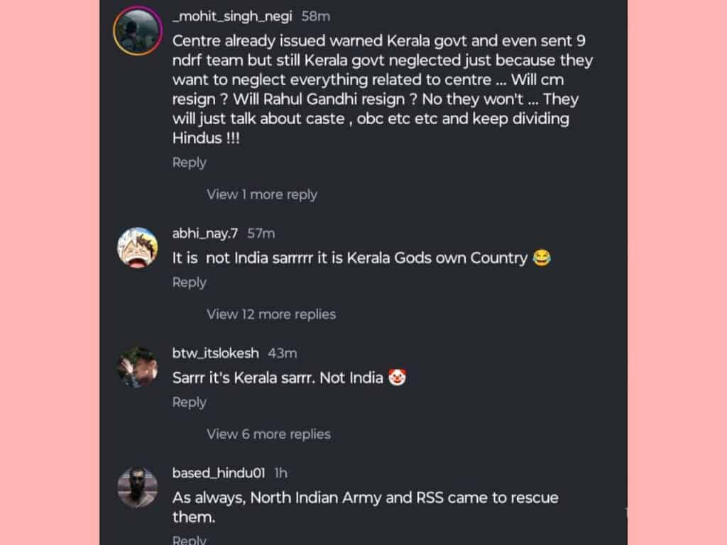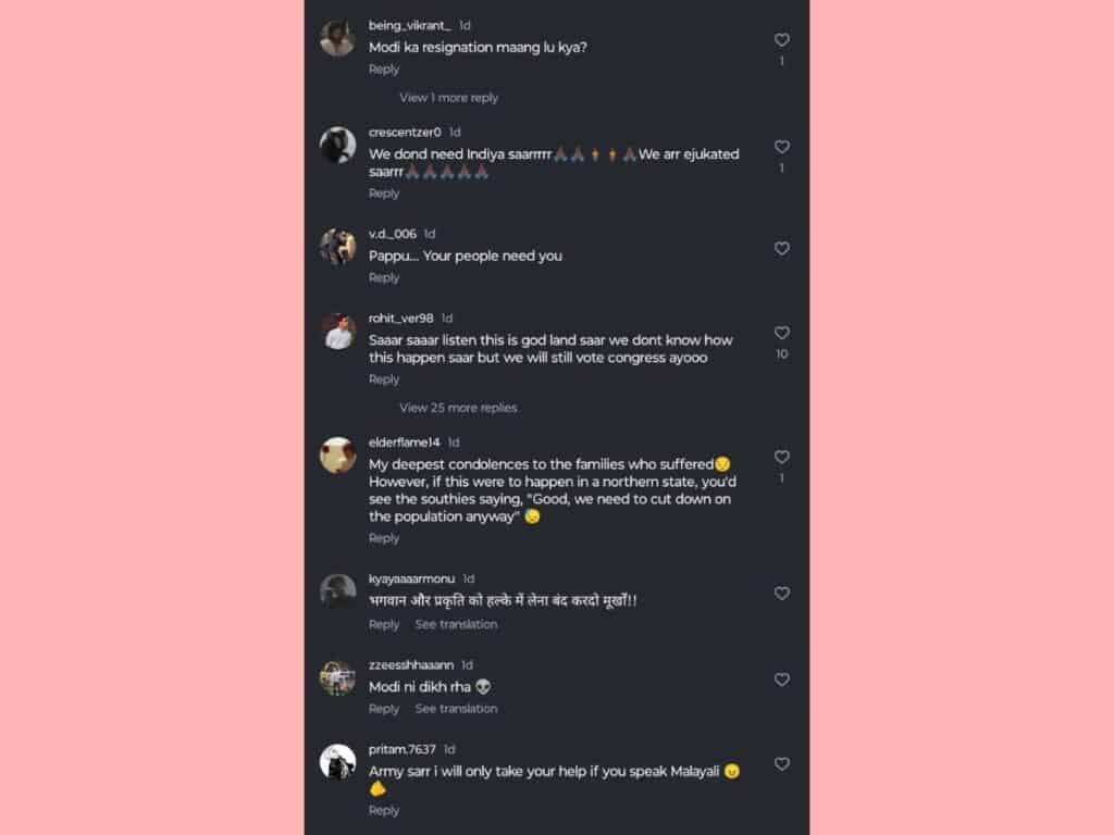 سوشل میڈیا پلیٹ فارم انسٹاگرام پر پوسٹ کیے گئے تبصروں میں کیرالہ اور وائناڈ کے لوگوں کو ناراض کرتے ہوئے دیکھا گیا۔
