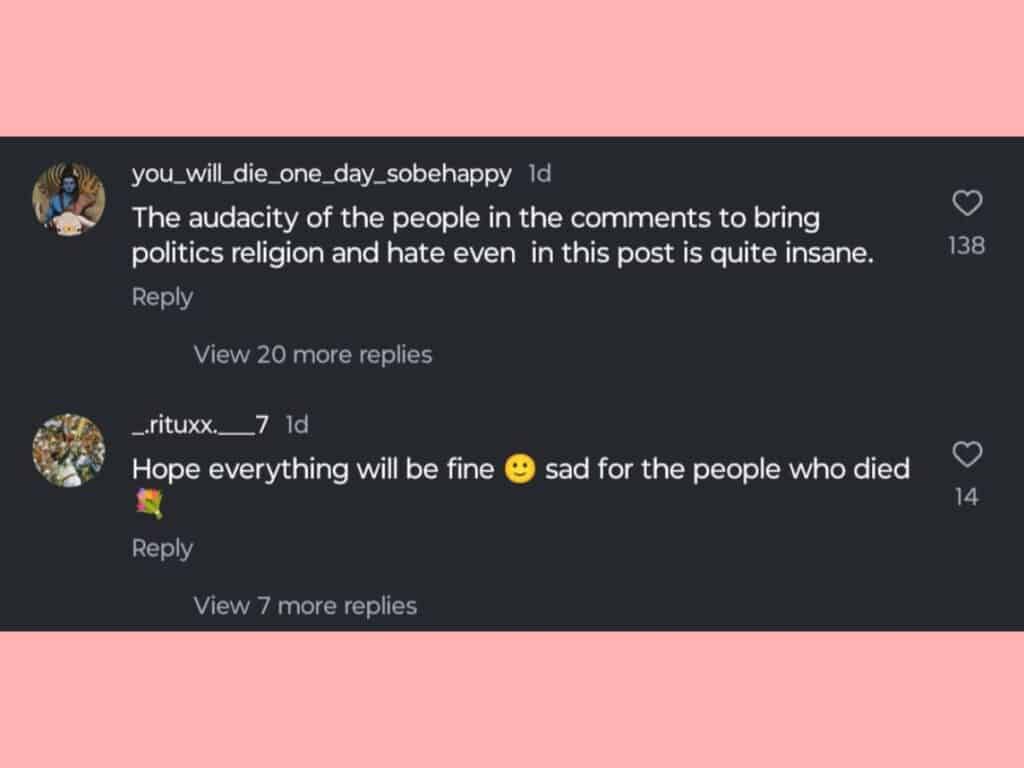 جہاں ایک انسٹاگرام صارف نے کہا کہ “قدرت آپ سب کو سکھائے گی، خدا آپ کے لیے شیطان بھیجے گا”، ایک اور نے کہا، “ہمیشہ کی طرح، شمالی ہندوستانی فوج اور آر ایس ایس انہیں بچانے آئے”۔