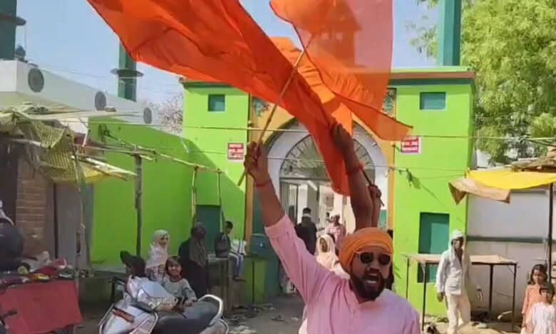اتوار، 6 اپریل کو اتر پردیش کے پریاگ راج ضلع میں رام نومی کا جشن مناتے ہوئے، ہندوتوا تنظیم کے ارکان، بڑی تعداد میں، بھگوا جھنڈے لہراتے ہوئے ایک مسجد کے اوپر چڑھ گئے۔