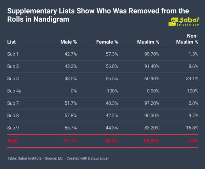 کلکتہ میں قائم پبلک پالیسی ریسرچ آرگنائزیشن، سبر انسٹی ٹیوٹ کے مطابق، الیکشن کمیشن آف انڈیا (ای سی آئی) کے اعداد و شمار سے پتہ چلتا ہے کہ مسلمانوں کو بڑے پیمانے پر ضمنی فہرستوں سے ہٹا دیا گیا ہے۔ فہرستوں میں سے چھ میں، خارج کیے گئے مسلمانوں کا تناسب 60.9 فیصد سے 98.7 فیصد تک ہے۔