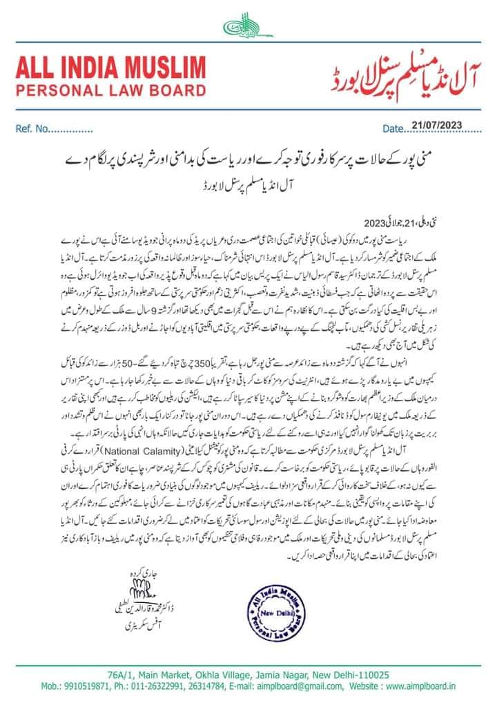 آل انڈیا مسلم پرسنل لا بورڈ مرکزی حکومت سے مطالبہ کرتا ہے کہ وہ منی پور کو نیشنل کیلامیٹی ( National Calamity)قرار دے کر فی الفور وہاں کے حالات پر قابو پائے، ریاستی حکومت کو برخاست کرے۔ قانون کی مشنری کو چوکس کرکے شر پسند عناصر، چاہے ان کا تعلق حکمراں پارٹی ہی سے کیوں نہ ہو، کے خلاف سخت کاروائی کرکے قرار واقعی سزا دلوائے۔ ریلیف کیمپوں میں موجود لوگوں کی بنیادی ضروریات کا فوری اہتمام کرے اور ان کی اپنے مقامات پر واپسی کو یقینی بنائے۔ منہدم مکانات اور مذہبی عبادت گاہوں کی تعمیر سرکاری خزانے سے کرائی جائے، مہلوکین کے ورثاء کو بھرپور معاوضہ ادا کیا جائے۔ منی پور میں حالات کی بحالی کے لئے اپوزیشن اور سول سوسائٹی تحریکات کو اعتماد میں لے کر ضروری اقدامات کئے جائیں۔ آل انڈیا مسلم پرسنل لا بور ڈ مسلمانوں کی دینی و ملی تحریکات اور ملک میں موجود رفاہی و فلاحی تنظیموں کو بھی آواز دیتا ہے کہ وہ منی پور میں ریلیف و بازآبادکاری نیز اعتماد کی بحالی کے اقدامات میں اپنا قرار واقعی حصہ ادا کریں ۔