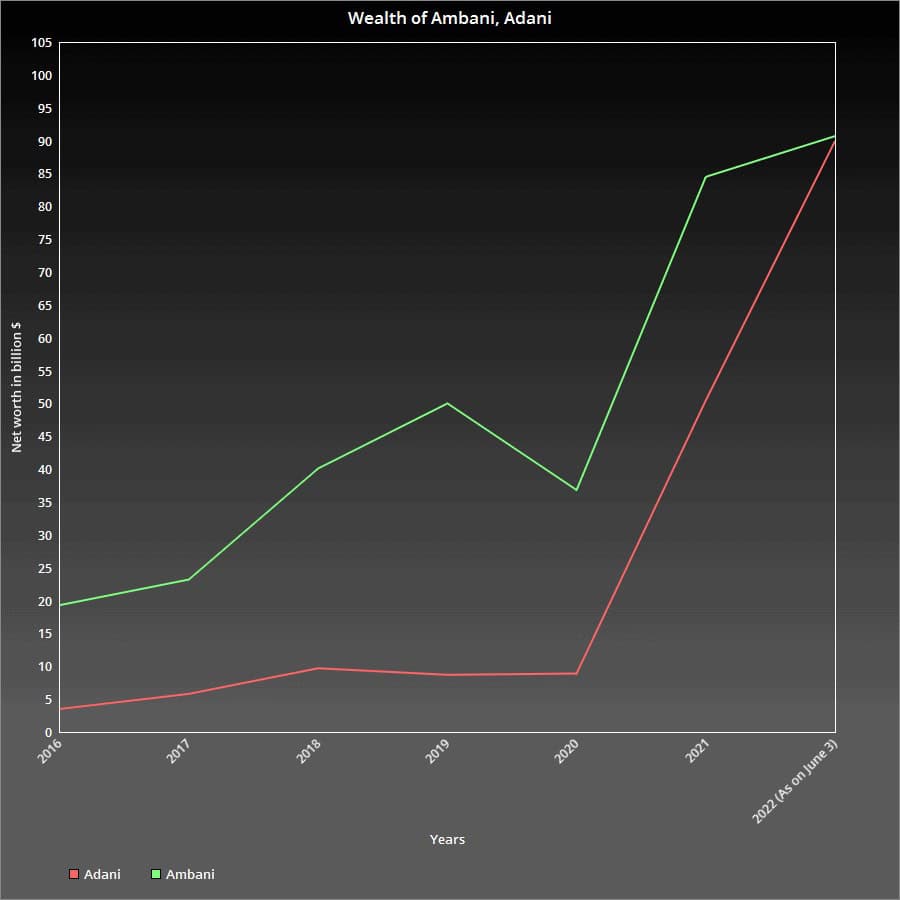 حالیہ سال میں دونوں ارب پتیوں کی کل دولت میں نماں اضافہ ہوا ہے۔اڈانی کی خالص دولت میں اضافہ کی وجہہ ان کی کمپنیوں کی حصص کی قیمتوں میں بے پناہ اضافہ ہے۔ تاہم مکیش امبانی اب بھی اڈانی کو سخت مقابلہ دینے میں کامیاب رہے ہیں