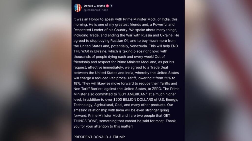 “وزیراعظم مودی کے لیے دوستی اور احترام کی وجہ سے اور، ان کی درخواست کے مطابق، فوری طور پر نافذ العمل، ہم نے امریکہ اور بھارت کے درمیان تجارتی معاہدے پر اتفاق کیا، جس کے تحت ریاست ہائے متحدہ امریکہ 25 فیصد سے کم کر کے اسے 18 فیصد کر دے گا، اسے 25 فیصد سے کم کر کے 18 فیصد کر دے گا،” ٹرمپ نے مودی کو اپنے “سب سے بڑے دوست” کے طور پر بیان کرتے ہوئے لکھا اور کہا کہ دونوں لیڈروں نے وہ کام کیا جو لوگوں نے مکمل کر لیے۔