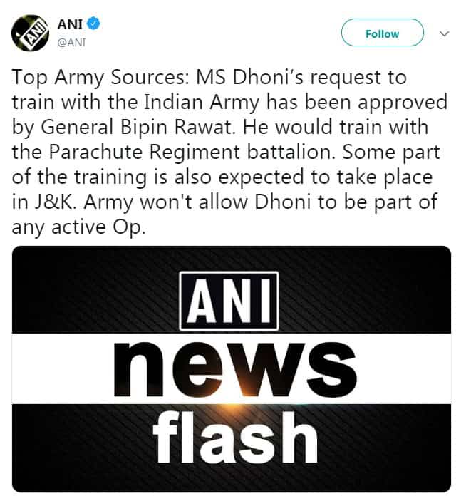 خود آرمی چیف بپن راوت نے دھونی کی ٹریننگ کو منظوری دی ہے۔ دھونی آئندہ کچھ دنوں تک فوج کی پیرا شوٹ ریجمنٹ بٹالین کے ساتھ ٹریننگ کریں گے۔ ایسا مانا جارہا ہے کہ دھونی کی ٹریننگ جموں وکشمیر میں بھی ہوگی۔ حالانکہ آرمی نے دونی ایکٹیوآپریشن میں حصہ لینے کی اجازت نہیں دی ہے۔