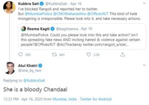 ممبئی۔ٹوئٹر پر جمعرات کے روزکنگانارانا وات کی بہن رنگولی چنڈیلہ کے اکاونٹ ان کی نفرت پر مشتمل تقریر وجہہ سے بند کردیاگیاہے۔ یوپی میں پتھر بازی پر رنگولی کے ٹوئٹ پر فلمی صنعت کے متعدد ممبرس کی جانب سے جانکاری دئے جائے کا نتیجہ یہ اقدام ہے۔