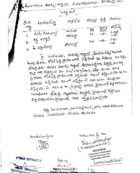 دریں اثنا، ریاستی حکومت نے فروری 2004 سے پیر کے روز دو محصولاتی دستاویزات جاری کیے ہیں، جن میں یونیورسٹی آف حیدرآباد سے محکمہ ریونیو کو سروے اور اراضی کی منتقلی اور اس کے برعکس دکھایا گیا ہے۔