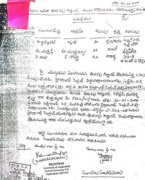 اس دستاویز میں اس وقت کے یو او ایچ رجسٹرار وائی نرسمہلو کے ساتھ گواہوں کے دستخط بھی درج تھے۔