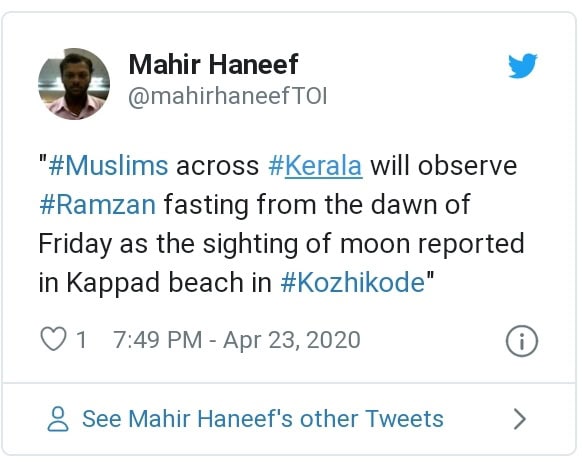 کپاڈ: جنوبی ہند کی مشہور ریاست کیرالا کے کپاڈ قصبہ میں چاند کی رؤیت ثابت ہو چکی ہے، کیرالا سمیت کرناٹک کے تمام ساحلی علاقے بھٹکل منگلور میں کل 24 اپریل بروز جمعہ پہلا روزہ ہوگا۔