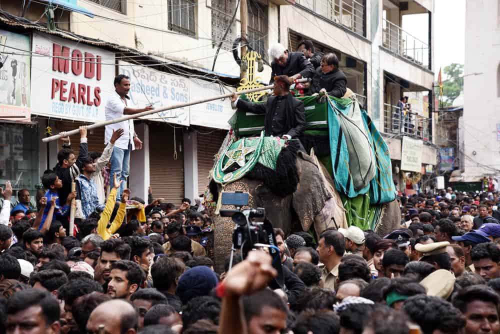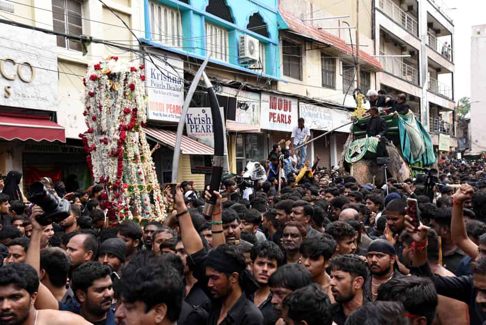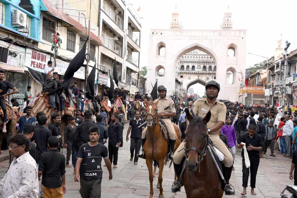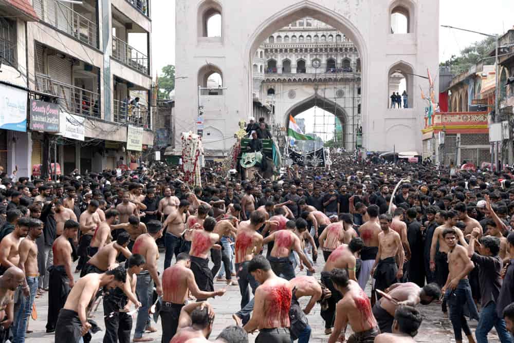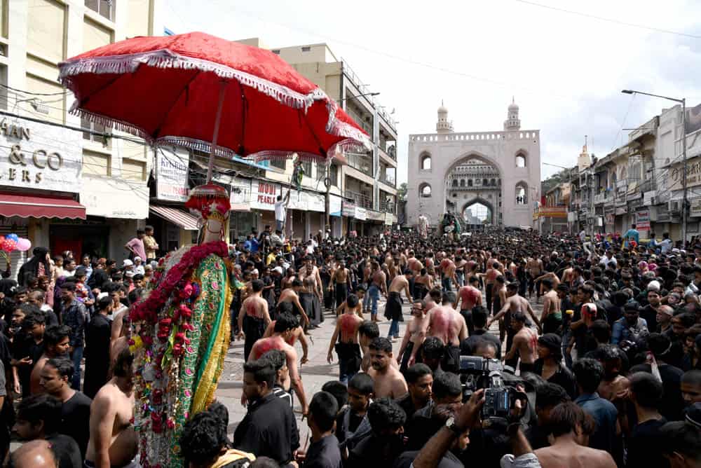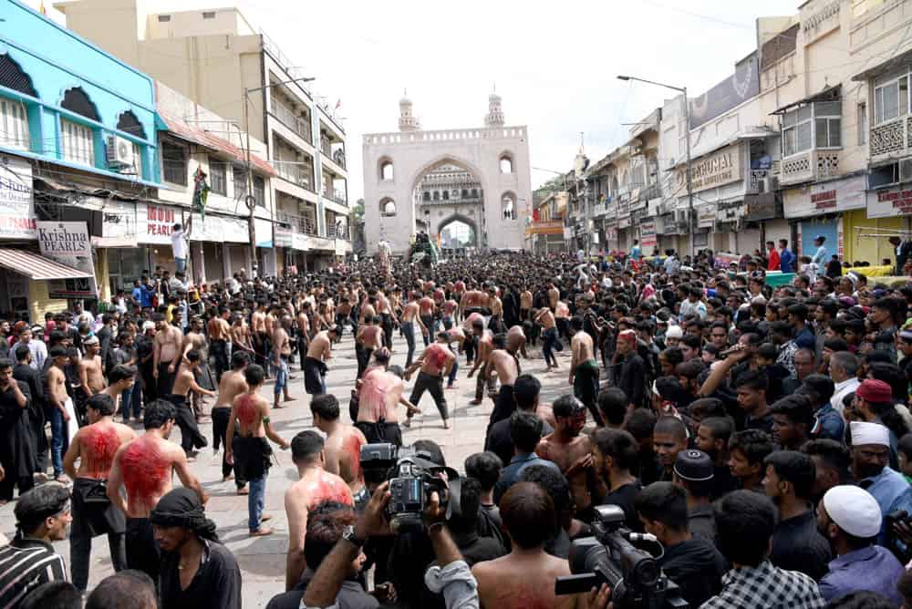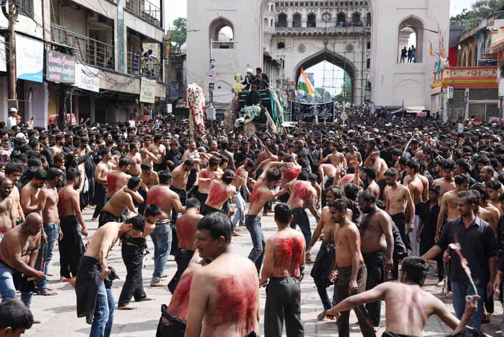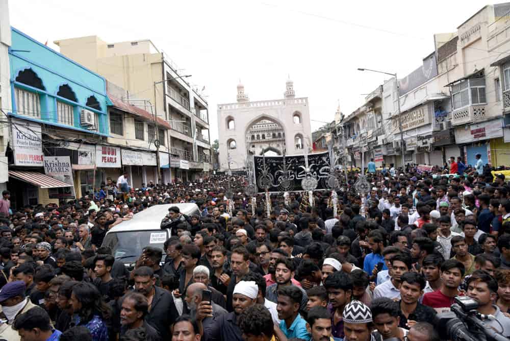 حیدرآباد۔قدیم شہر حیدرآباد غم اور ماتم کی ایک فضاء کا ماحول دیکھا گیا کیونکہ منگل کے روز”یوم عاشورہ“ نہایت عقیدت او راحترام کے ساتھ منایاگیا۔شیعہ کمیونٹی کی جانب سے نکالے گئے روایتی اور تاریخی ”بی بی کے عالم“کے دوان لوگ سیاہ لباس زیب تن کئے ماتم کرتے ہوئے دیکھائی دئے۔