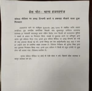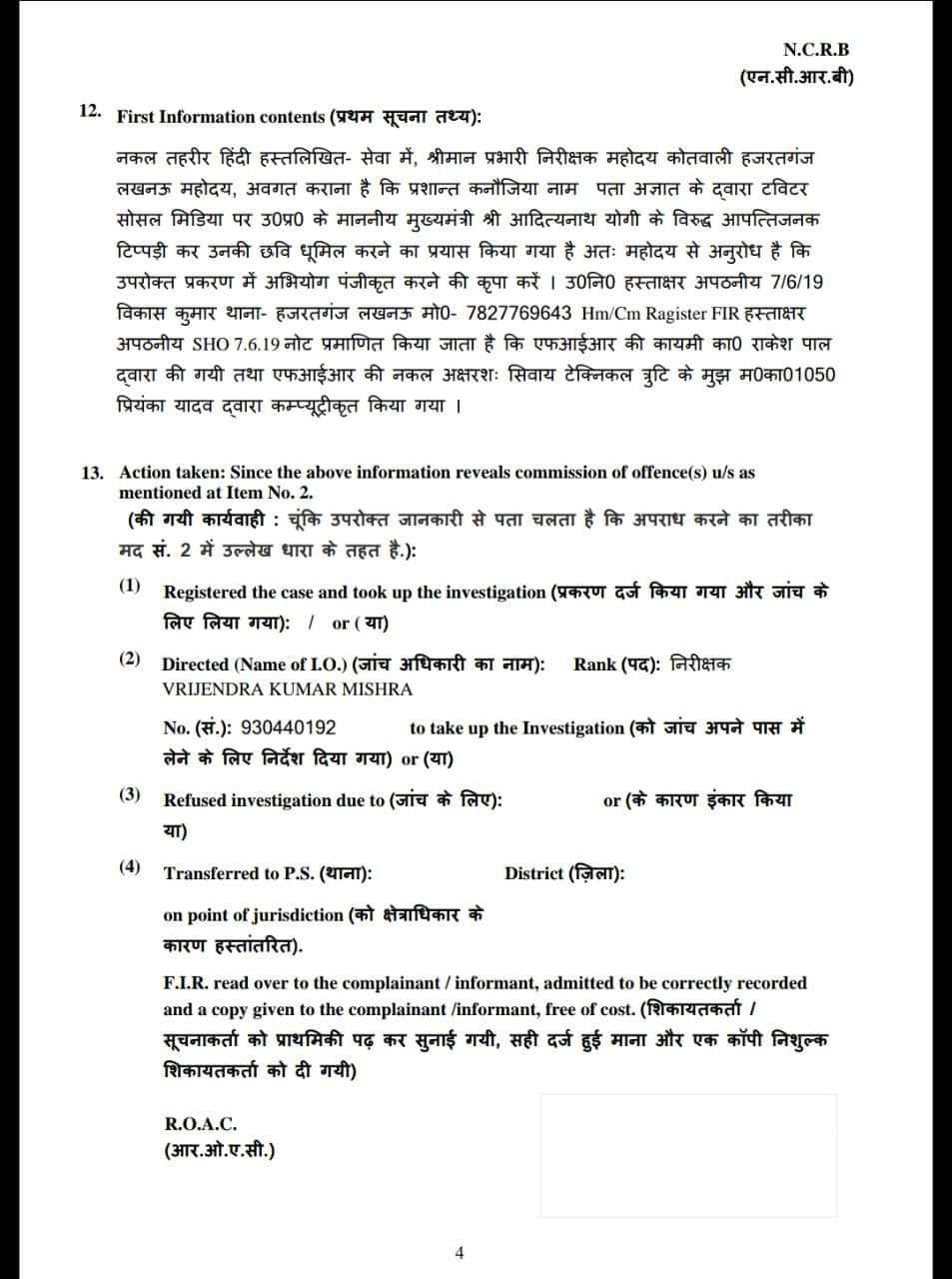 کانوجیاپر یہ الزام عائد کیاکہ انہوں نے یوگی ادتیہ ناتھ کے خلاف”ٹوئٹر سوشیل میڈیا“ پر توہین آمیز تبصرہ کیا اور”چیف منسٹر کی شبہہ کو متاثرکرنے“ کی ایک کوشش کی ہے۔