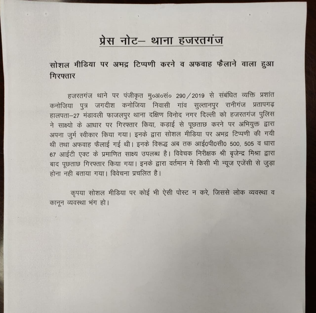 کانوجیانے سوشیل میڈیا پر چیف منسٹر یوگی ادتیہ ناتھ جو وزرات داخلہ کا قلمدان بھی رکھتے ہیں کے خلاف”قابل اعتراض تبصرہ“کرنے کی وجہہ سے یہ گرفتاری انجام پائی ہے۔