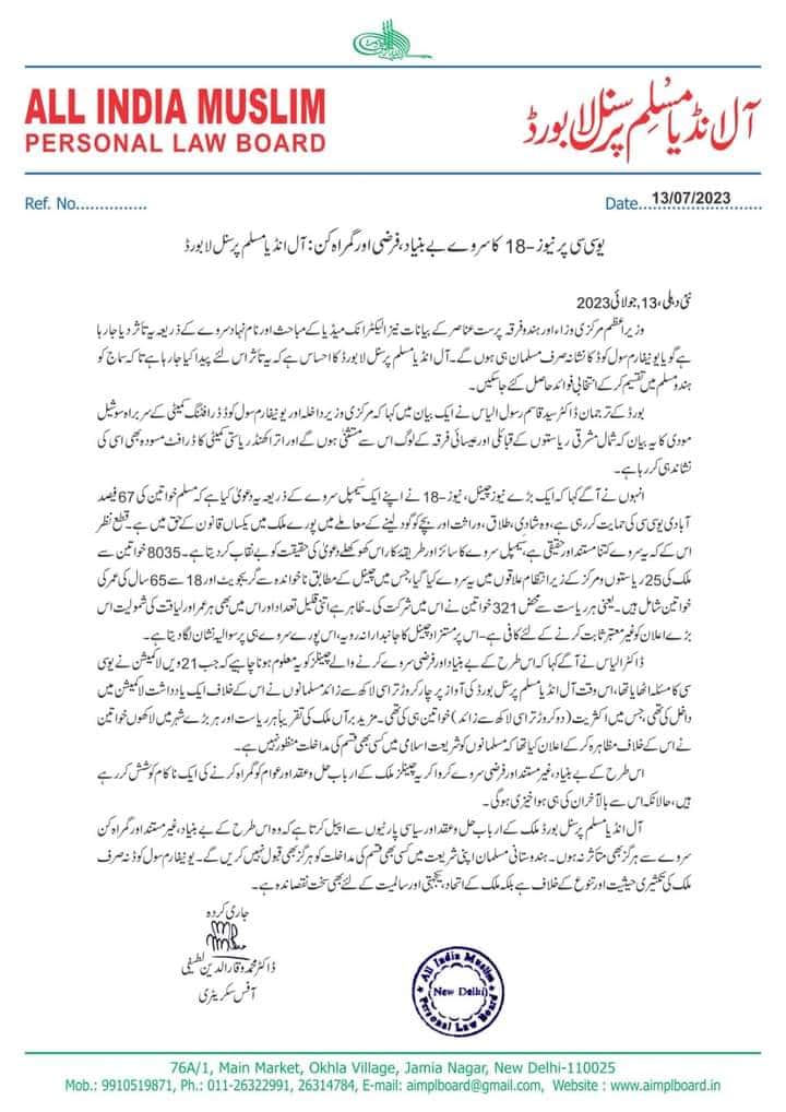 آل انڈیا مسلم پرسنل بورڈ ملک کے ارباب حل و عقد اور سیاسی پارٹیوں سے اپیل کرتا ہے کہ وہ اس طرح کے بے بنیاد، غیر مستند اور گمراہ کن سروے سے ہرگز بھی متأثر نہ ہوں۔ ہندوستانی مسلمان اپنی شریعت میں کسی بھی قسم کی مداخلت کو ہرگز بھی قبول نہیں کریں گے۔ یونیفارم سول کوڈ نہ صرف ملک کی تکثیری حیثیت اور تنوع کے خلاف ہے بلکہ ملک کے اتحاد، یکجہتی اور سالمیت کے لئے بھی سخت نقصاندہ ہے۔
