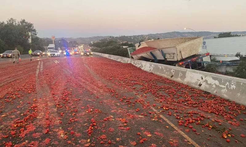 کیلیفورنیا: امریکی ریاست کیلیفورنیا میں ہائی وے پر ٹماٹروں سے لدا ٹرک دو گاڑیاں سے ٹکرا گیا جس کے نتیجے میں اس میں موجود لاکھوں کی تعداد میں ٹماٹر سڑک