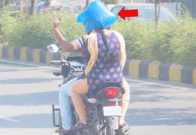 حیدرآباد28اکتوبر(یواین آئی) شہر حیدرآباد میں ٹووہیلر کی پچھلی نشست پر سوارایک خاتون نے ہیلمٹ کے متبادل کے طورپر پلاسٹک کے کور سے اپنے سر کو ڈھانک لیا۔اس خاتون کی اس