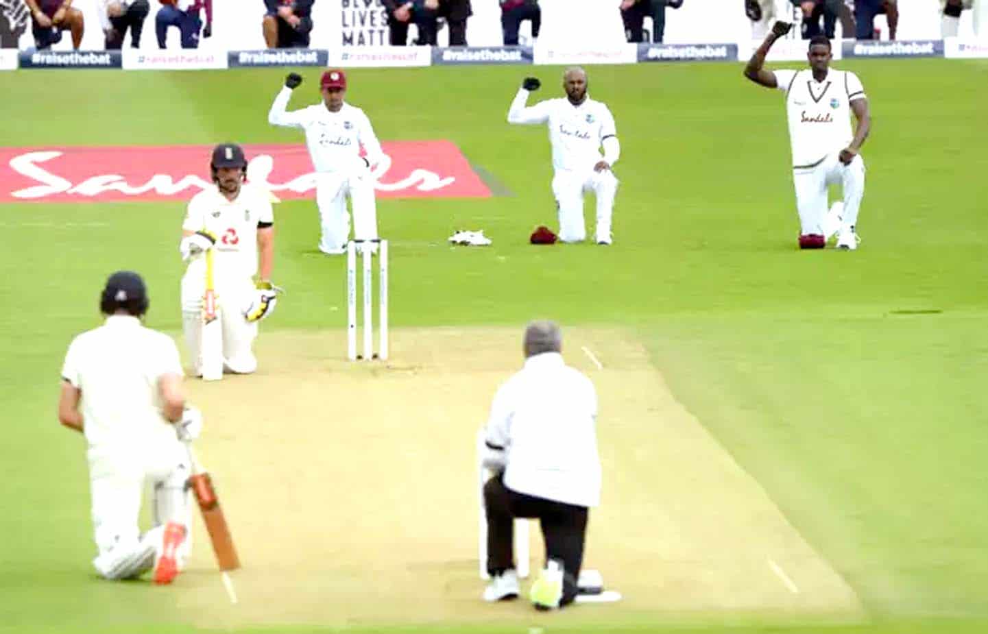 ساؤتھمپٹن۔ انگلینڈ اور ویسٹ انڈیز کے کرکٹرزز نسل پرستی کے خلاف متحد ہوگئے۔انگلینڈ اور ویسٹ انڈیز میں پہلا ٹسٹ شروع ہوا۔ ساوتھمپٹن میں میچ سے قبل دونوں ٹیموں کے کھلاڑیوں