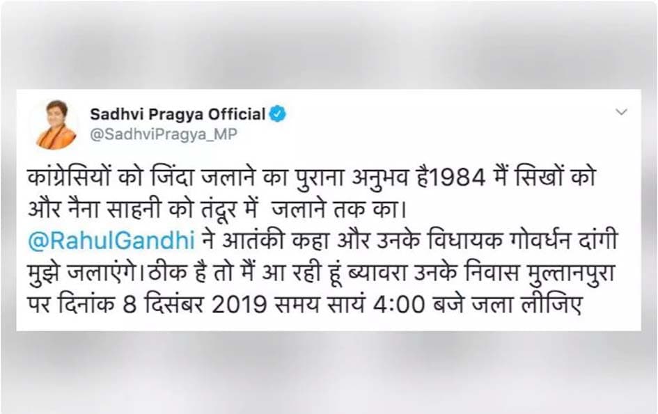 ٭ مدھیہ پردیش کے کانگریس ایم ایل اے گوردھن ڈانگی کی بی جے پی ایم پی پرگیہ ٹھاکر کو ریاست میں داخلے پر زندہ جلا ڈالنے کی دھمکی کے ایک