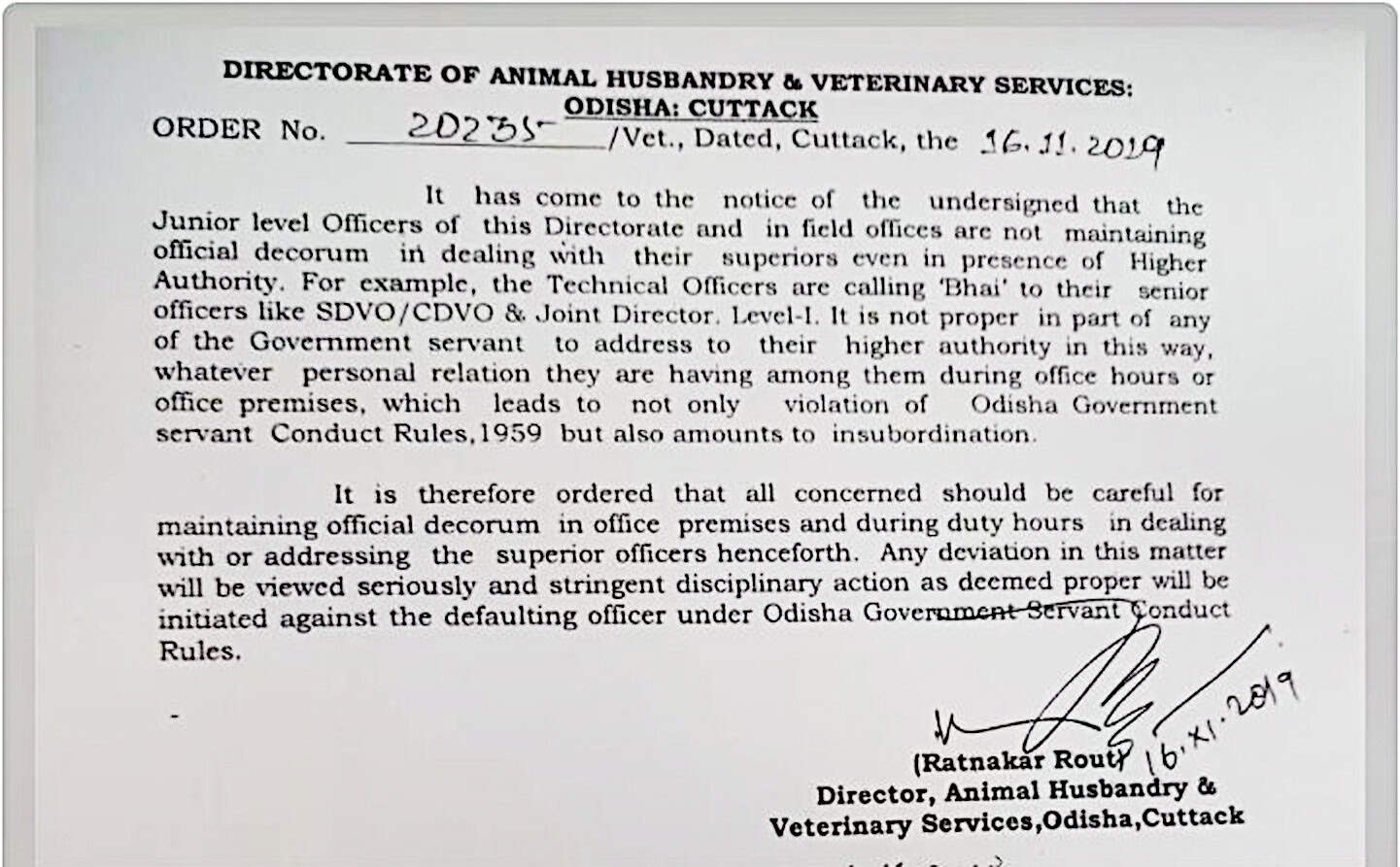 بھوبنیشور 19 نومبر ( سیاست ڈاٹ کام ) اوڈیشہ میں ڈائرکٹوریٹ افزائش مویشیان نے جونئیر سطح کے عہدیداروں کو انتباہ دیا ہے کہ وہ اپنے سینئرس کو ’’ بھائی ‘‘