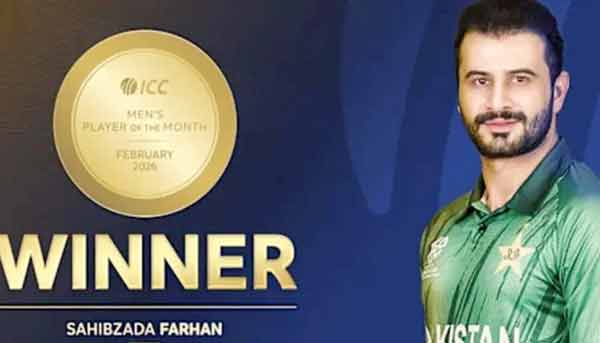دبئی ۔ 23؍مارچ (ایجنسیز )انٹرنیشنل کرکٹ کونسل (آئی سی سی) نے پاکستان کے صاحبزادہ فرحان کو پلیئر آف دی منتھ قرار دے دیا۔صاحبزادہ فرحان کو فروری میں غیرمعمولی کارکردگی پر