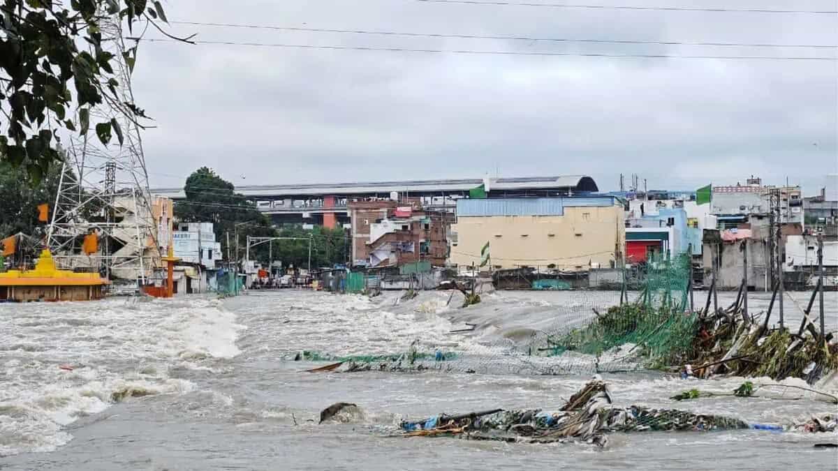 موسلا دھار بارش کے بعد عثمان ساگر اور حمایت ساگرکے دروازے کھولے جانے کے بعد دریائے موسی پانی سے بھرا ہوا ہے۔ حیدرآباد: بہادر پورہ حلقہ کے اسدبابا نگر، کشن